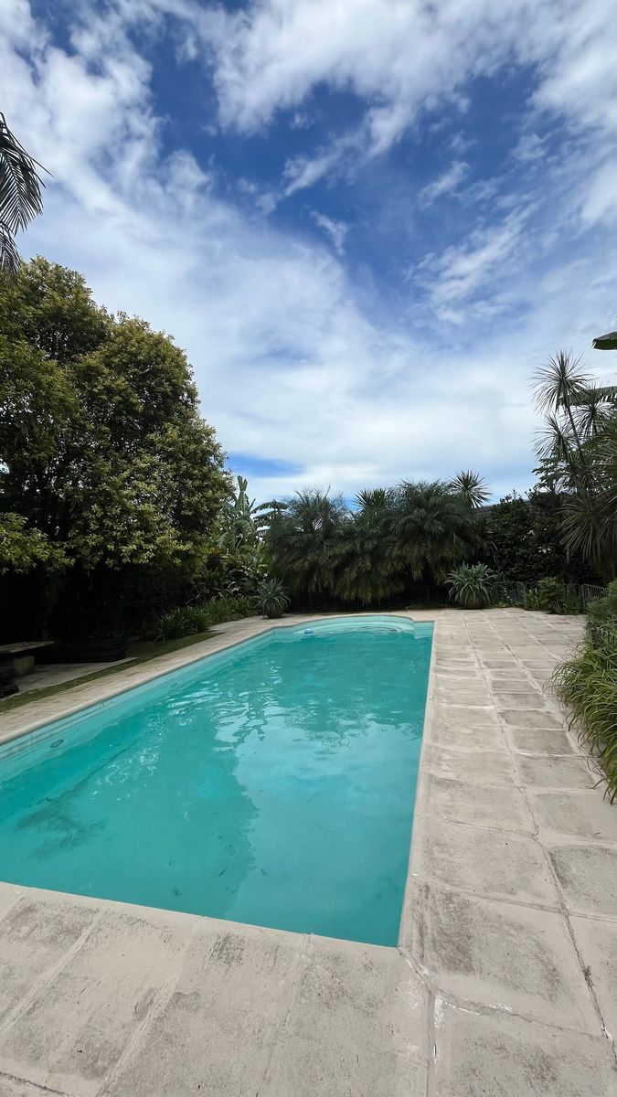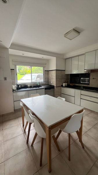 En planta baja se desarrollan los principales espacios sociales: living comedor, estar, cocina comedor, escritorio, lavadero y dependencia de servicio. La galería en altura balconea hacia el jardín, integrándose con la pileta y el verde del lote.